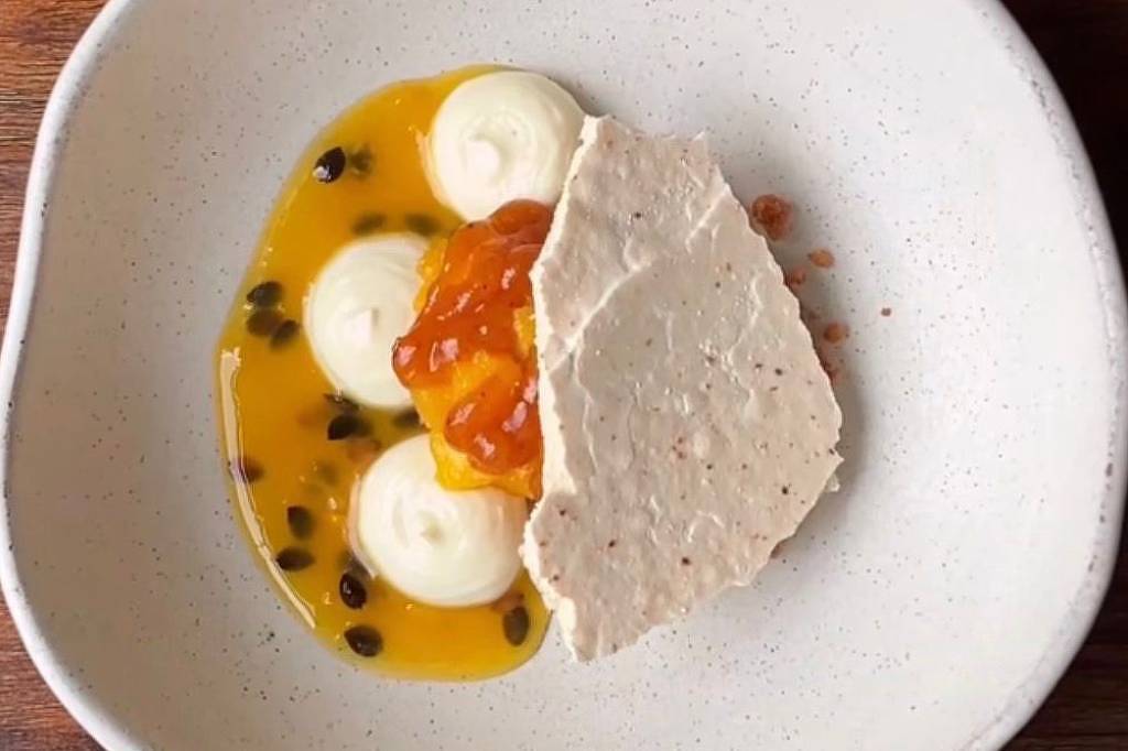 Manga com farelo de leite queimado, ganache de iogurte, calda de maracujá, gochugaru (pimenta coreana) e suspiro
